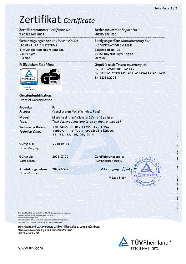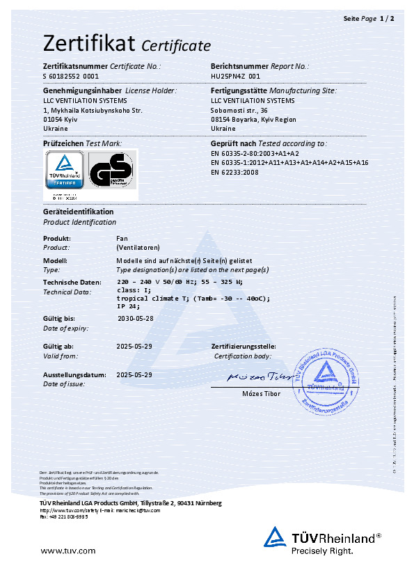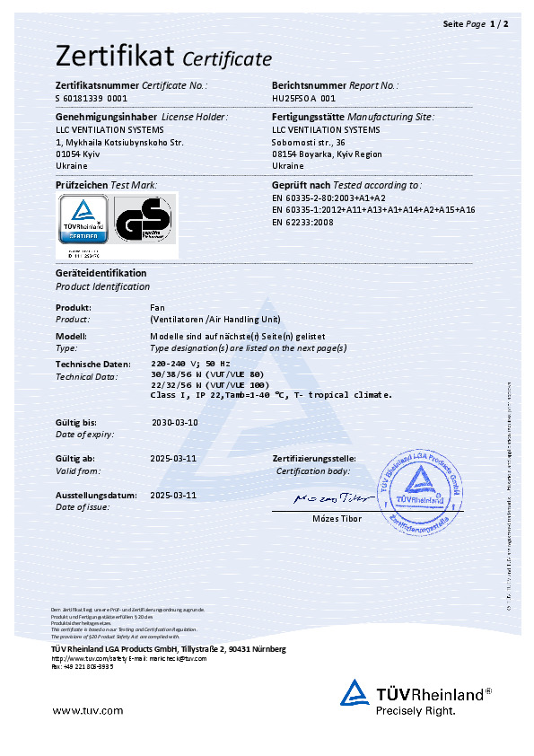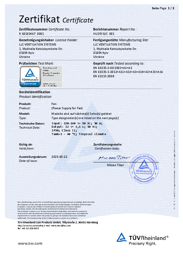 Сертификат УкрСЕПРО "Приточно-вытяжные установки с электрическим нагревателем"